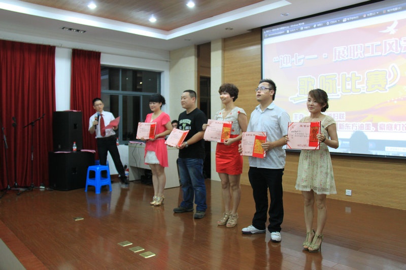 比賽結(jié)束后,鳳鳴街道領(lǐng)導(dǎo)郁歡、吳霞萍、勞偉根等向獲得一、二、三等獎(jiǎng)的選手頒發(fā)證書(shū)和獎(jiǎng)金,我公司蔣亞群的《軍港之夜》、趙健的《中國(guó)人》、平曉紅的《愛(ài)的奉獻(xiàn)》獲三等獎(jiǎng),周志生的《我的老班長(zhǎng)》獲優(yōu)秀獎(jiǎng)。